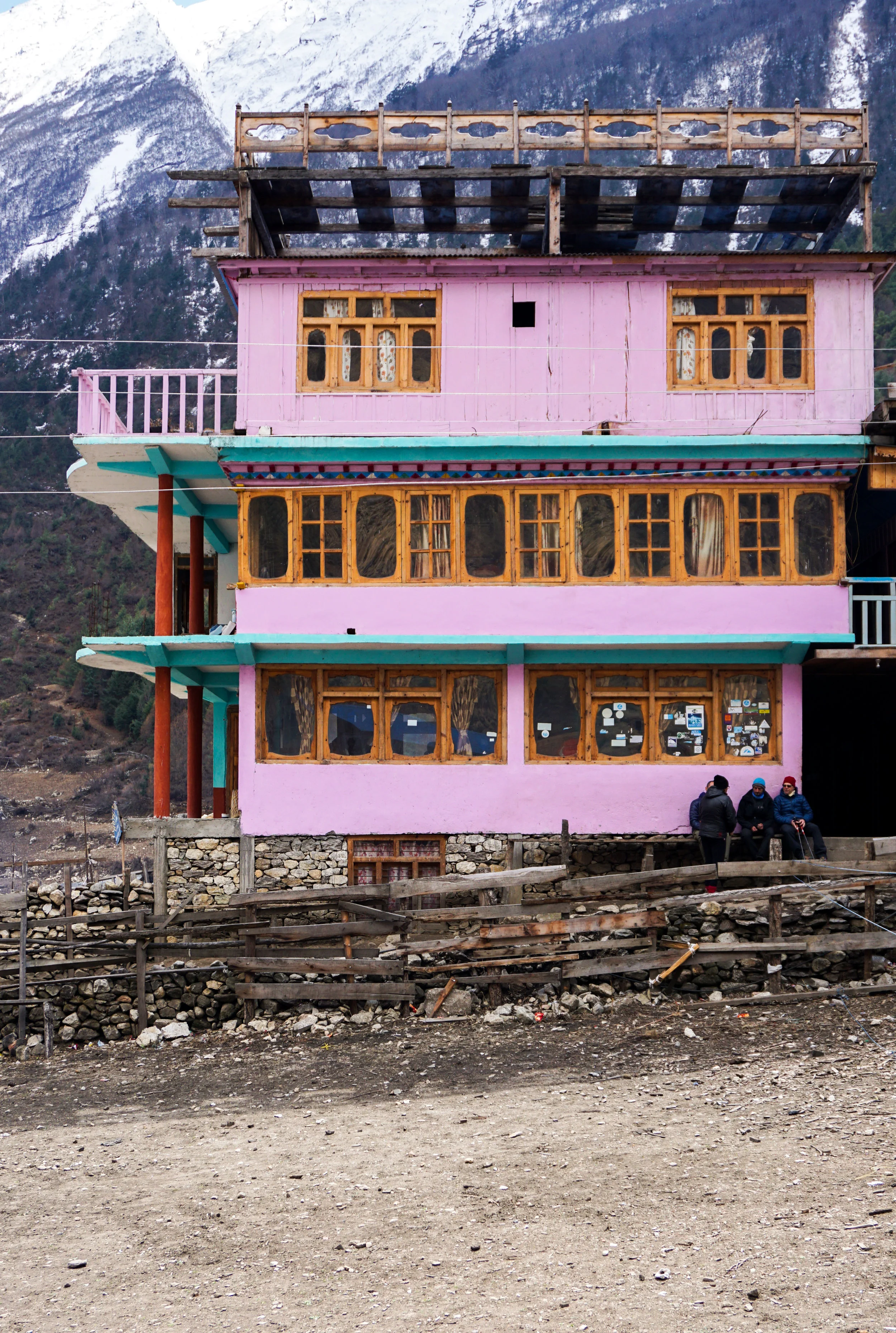 Lho was quite a cute little village. We hung out on the field enclosed by little teahouses and small cabins upon arrival, chilling in the hammocks with the sun in our faces. On the picture below you can see our two cabins just to the right of the flag.
