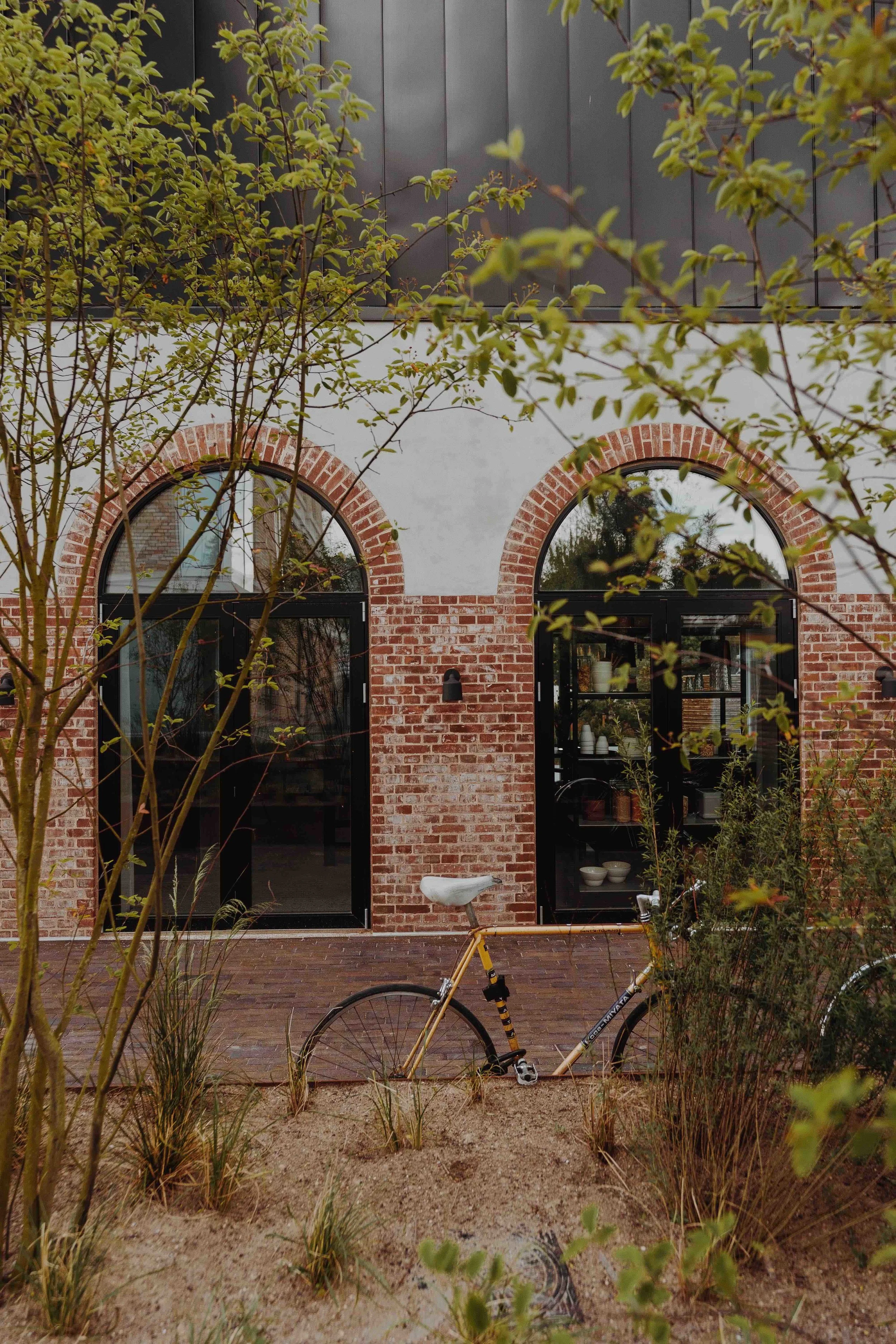 The facades are kept in red brick, and concrete has ‘filled in the gaps’ making the patterns of the brickwork stand out, like jewels on the house. The second floor and roof are black sheets of steel - the modern counterpart to the heritage site. Arch windows have been extended to ground level, becoming steel framed glass doors, that like the Vipp Shelter did - totally washes away the line between what is inside and outside.