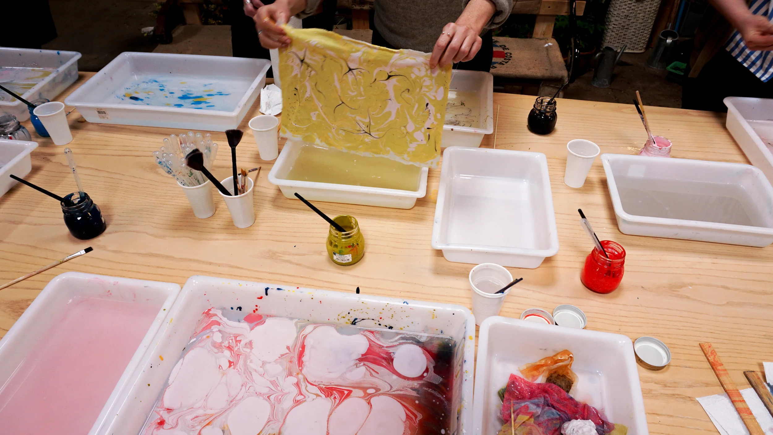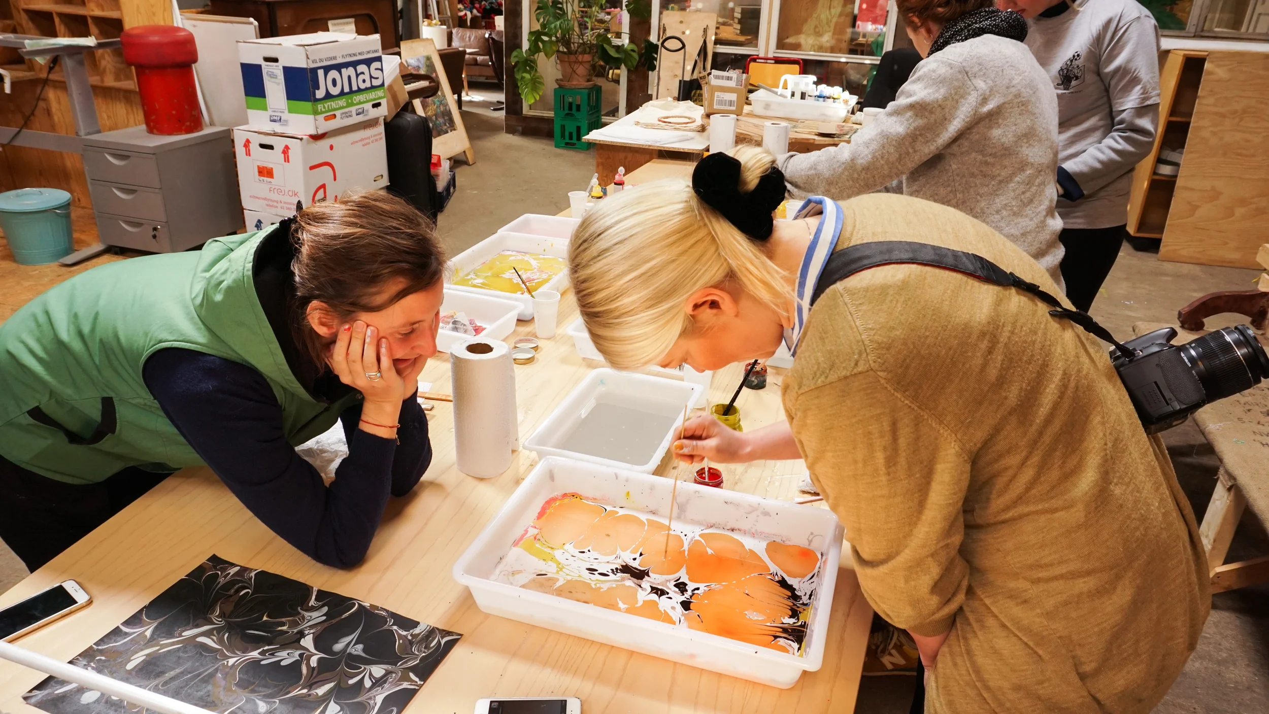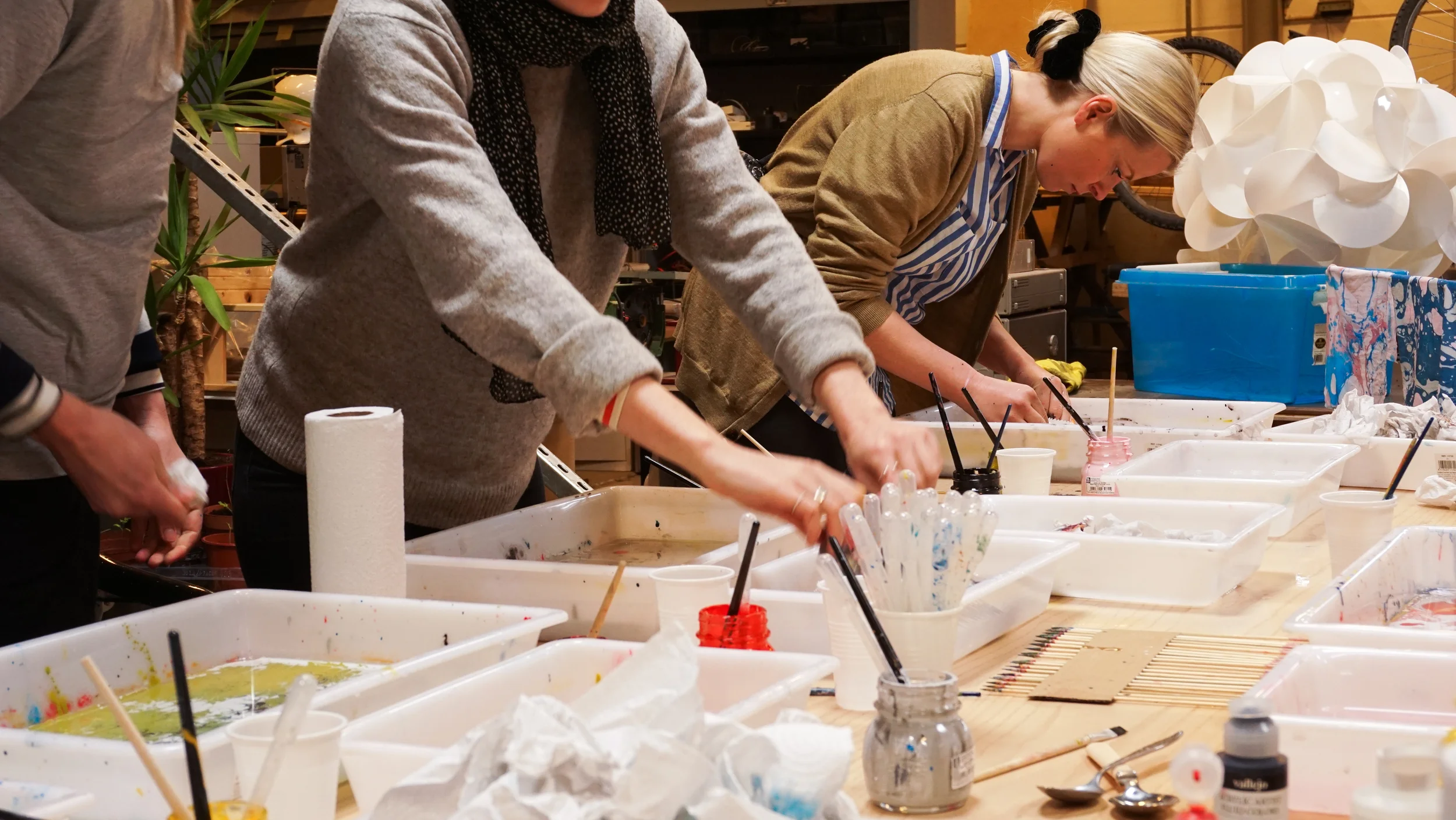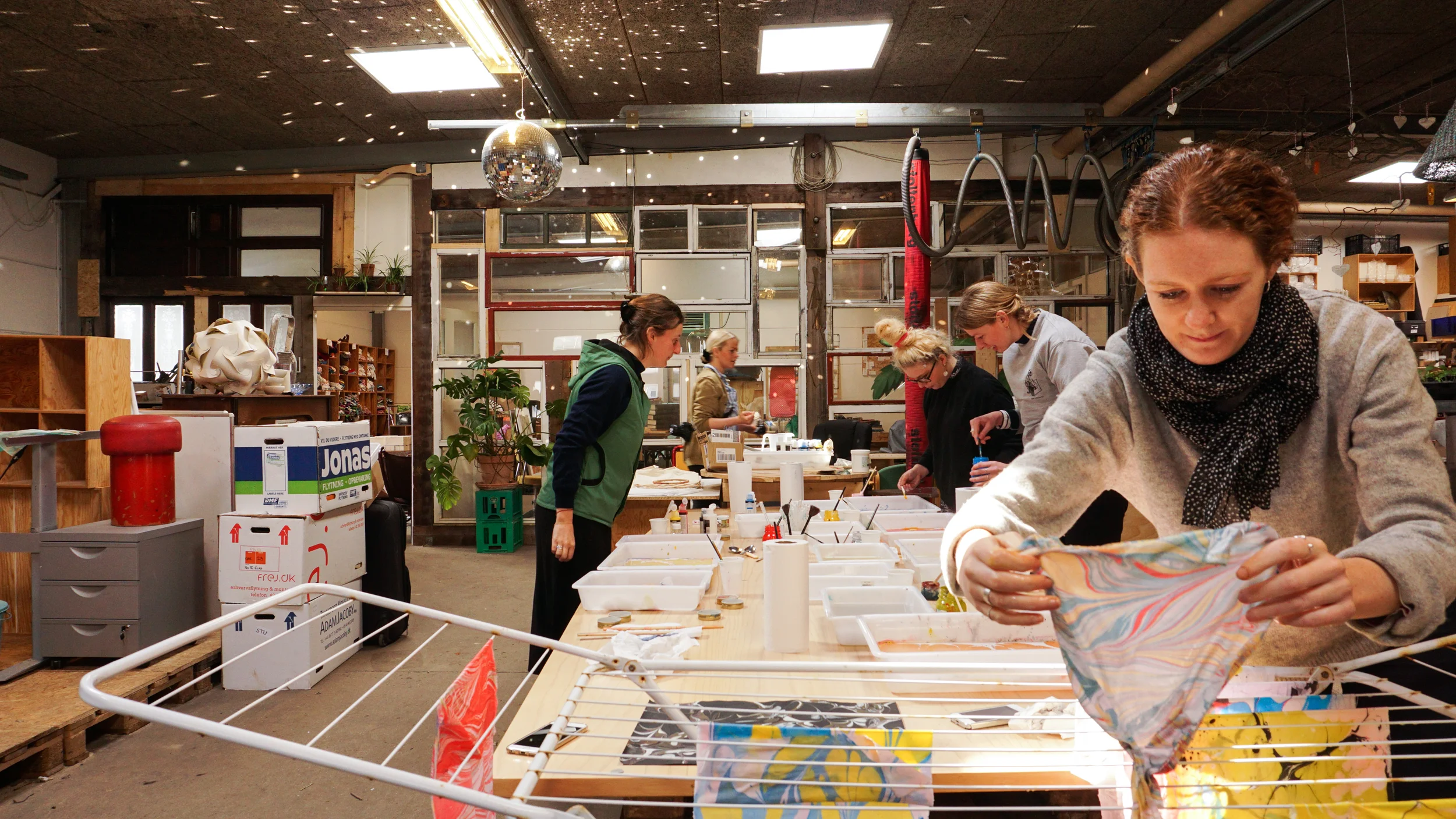 In April 2016, MarbleMatter and myself hosted our first workshops together - a collaboration we have been wanting to get on with since last summer, when we started marbling together in Barcelona. The two workshops took place in Guldminen Kbh, an old warehouse located in Sydhavnen, Copenhagen. This is a fantastic space with an up-cycling concept behind it. The location and using second-hand textiles for the events went perfectly hand in hand.
