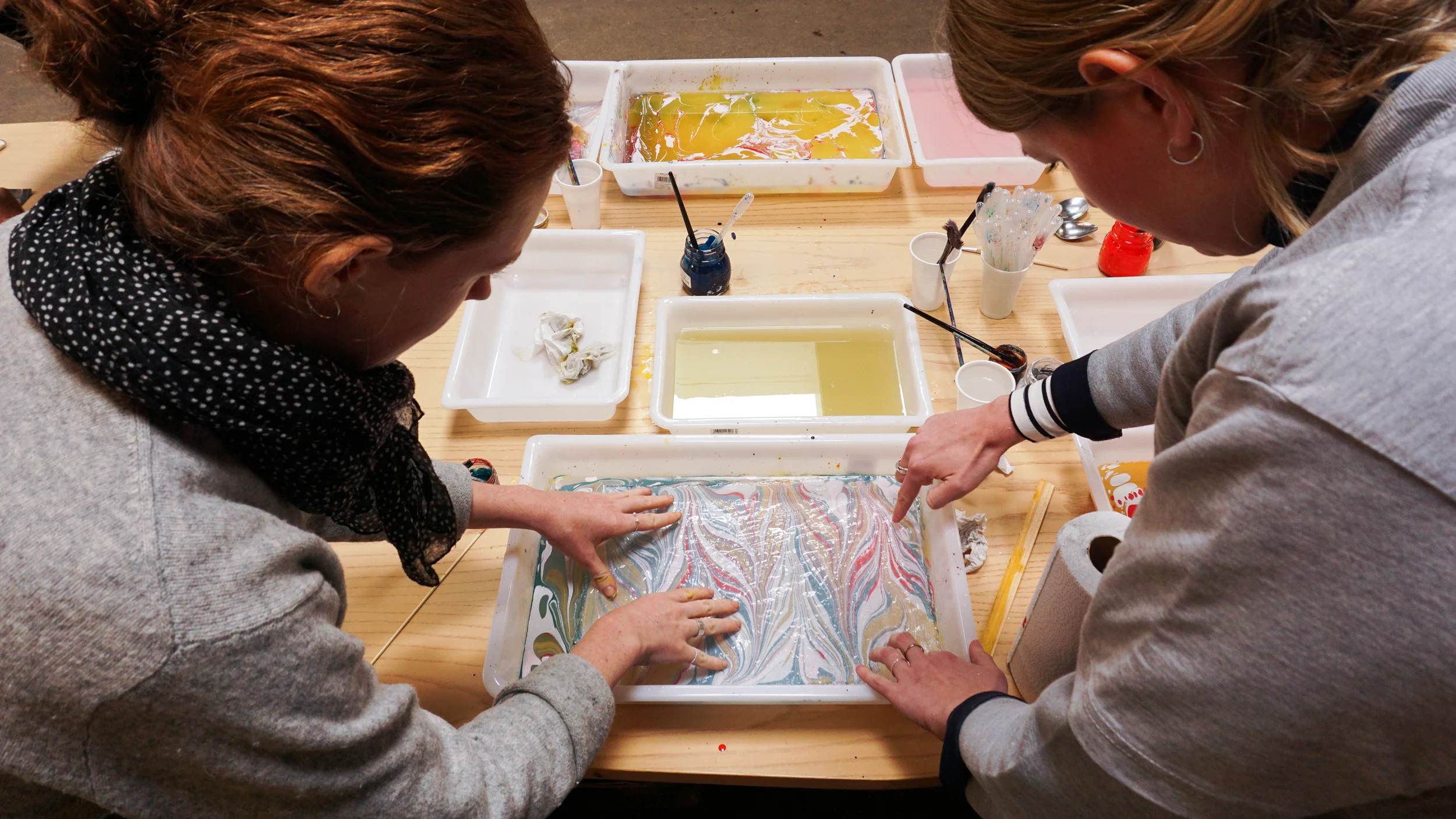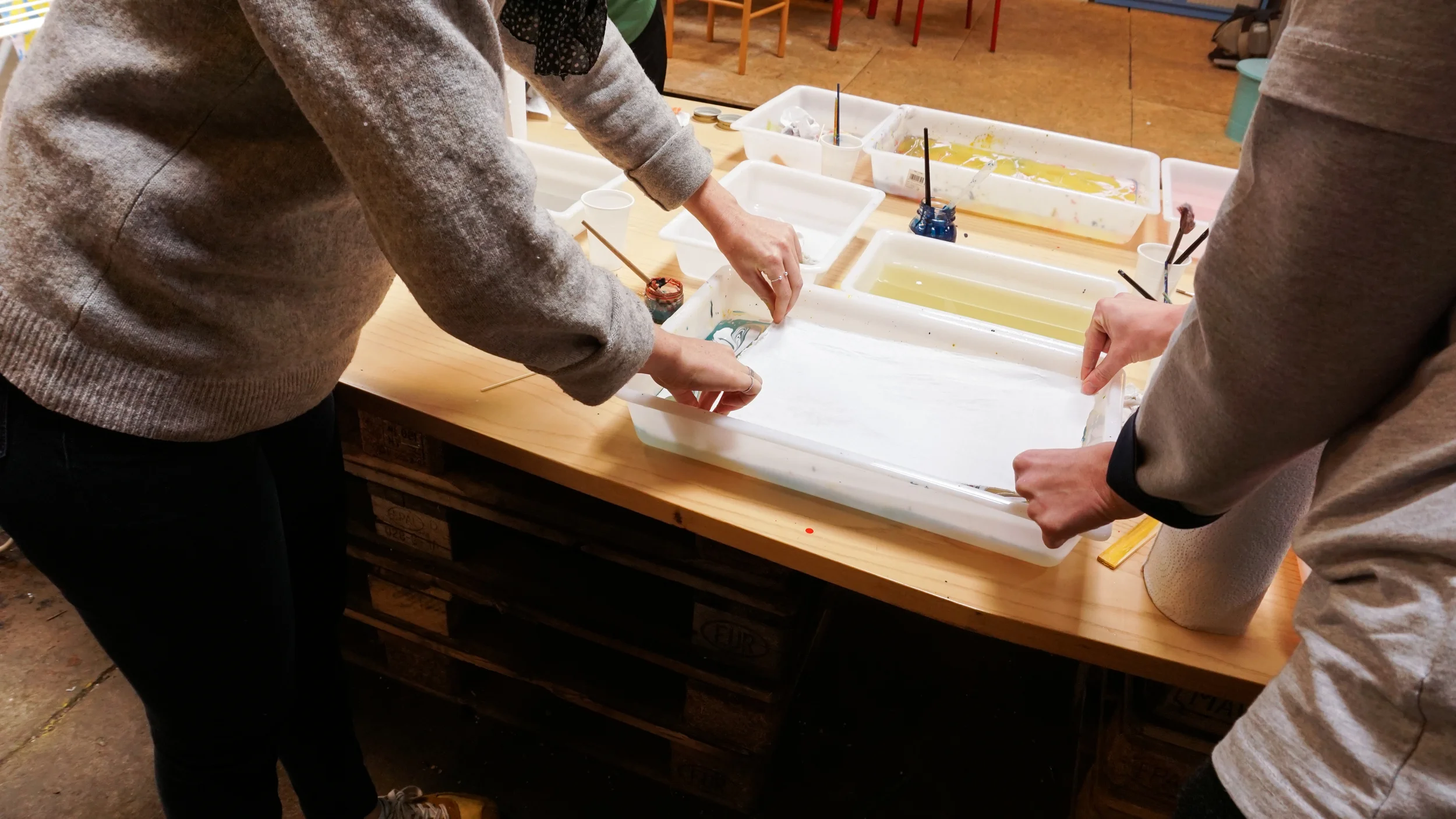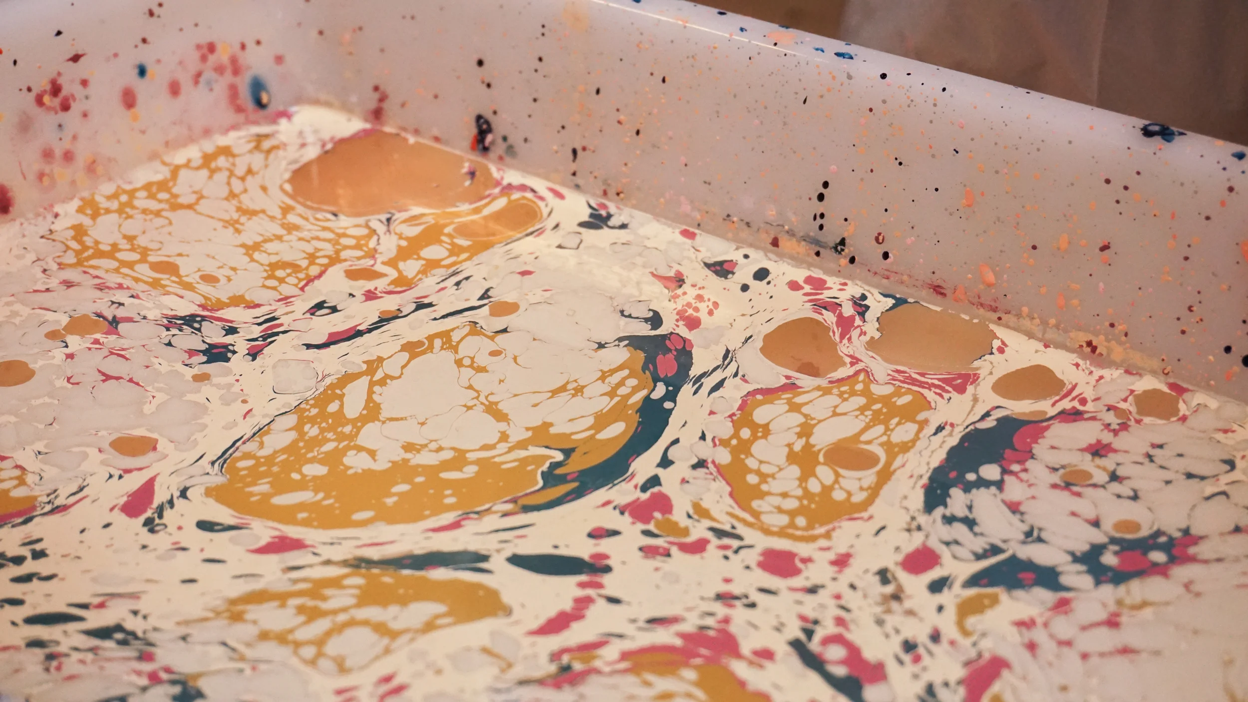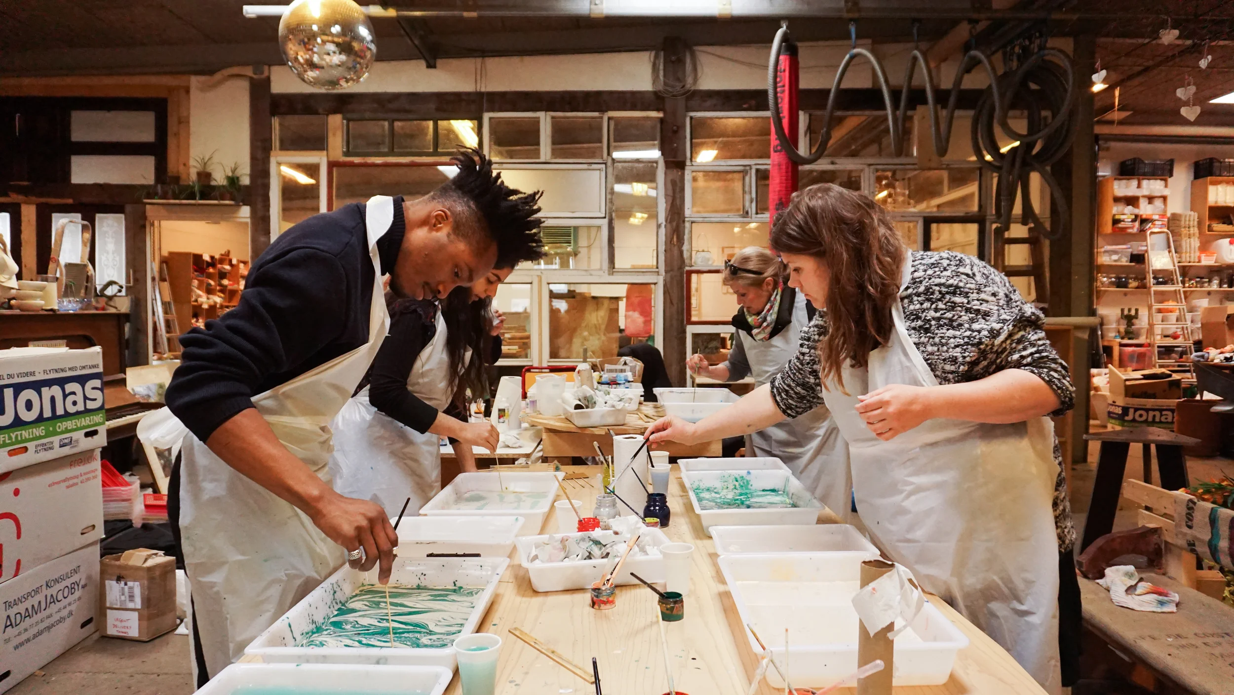 In April 2016, MarbleMatter and myself hosted our first workshops together - a collaboration we have been wanting to get on with since last summer, when we started marbling together in Barcelona. The two workshops took place in Guldminen Kbh, an old warehouse located in Sydhavnen, Copenhagen. This is a fantastic space with an up-cycling concept behind it. The location and using second-hand textiles for the events went perfectly hand in hand.
