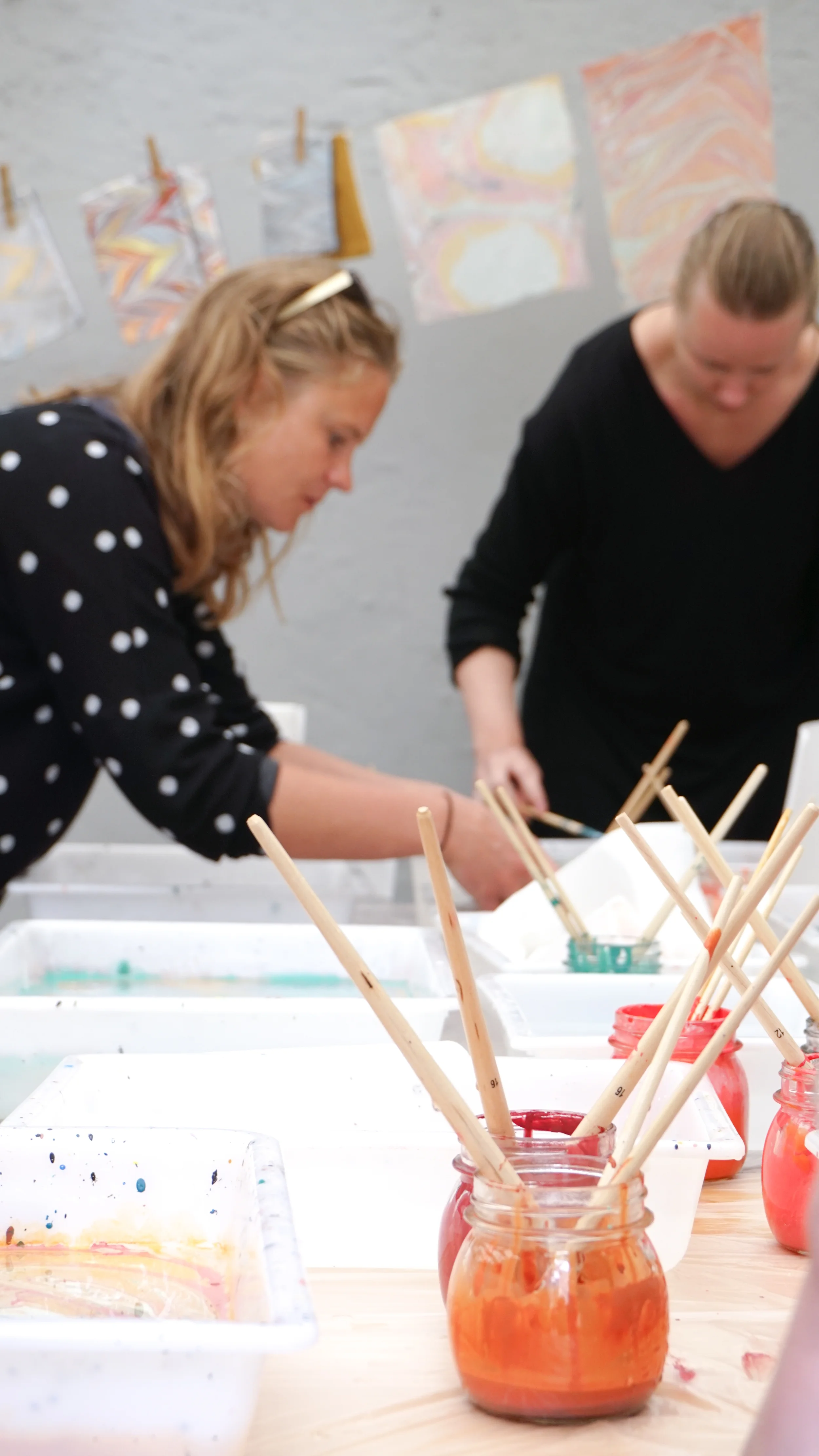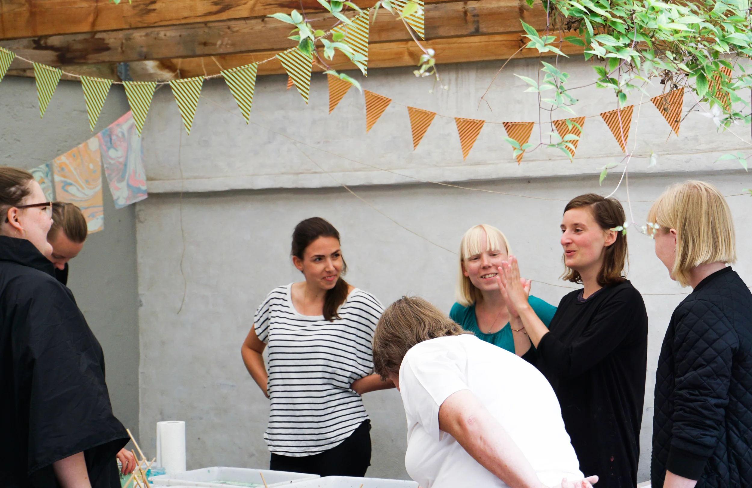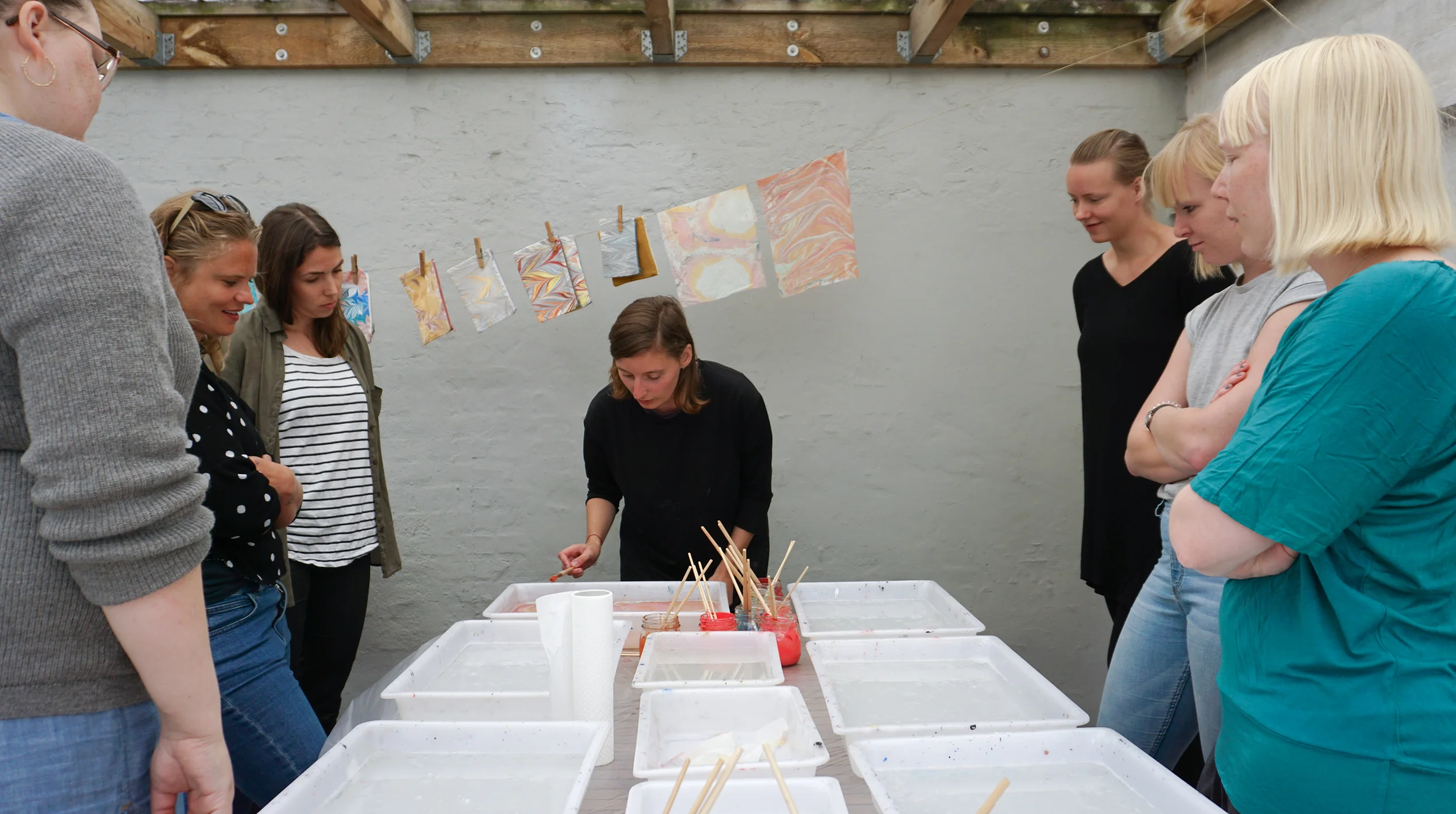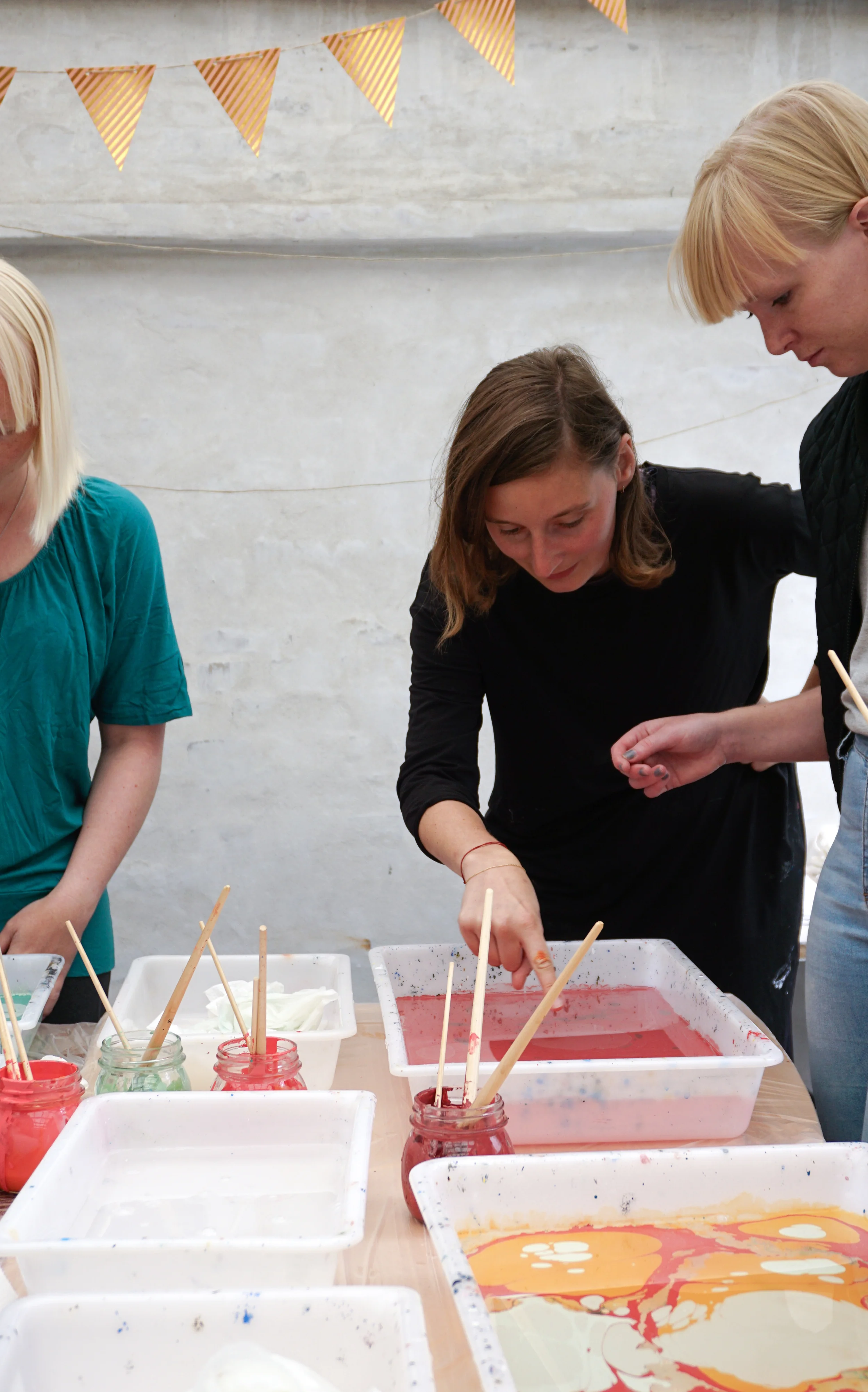 July means warm sunny days spent outside in the open! However, Northern summers can be quite unstable and when scouting for a location a few weeks back we had no idea about the weather forecasts for this day. Luckily Marble Matter and I ended up finding a cosy backyard in the heart of Østerbro with a sheltered patio, perfect for hosting an outdoor marbling workshop! So on a cloudy Saturday on the 16th of July, our participants marbled to the sound of summer rain.