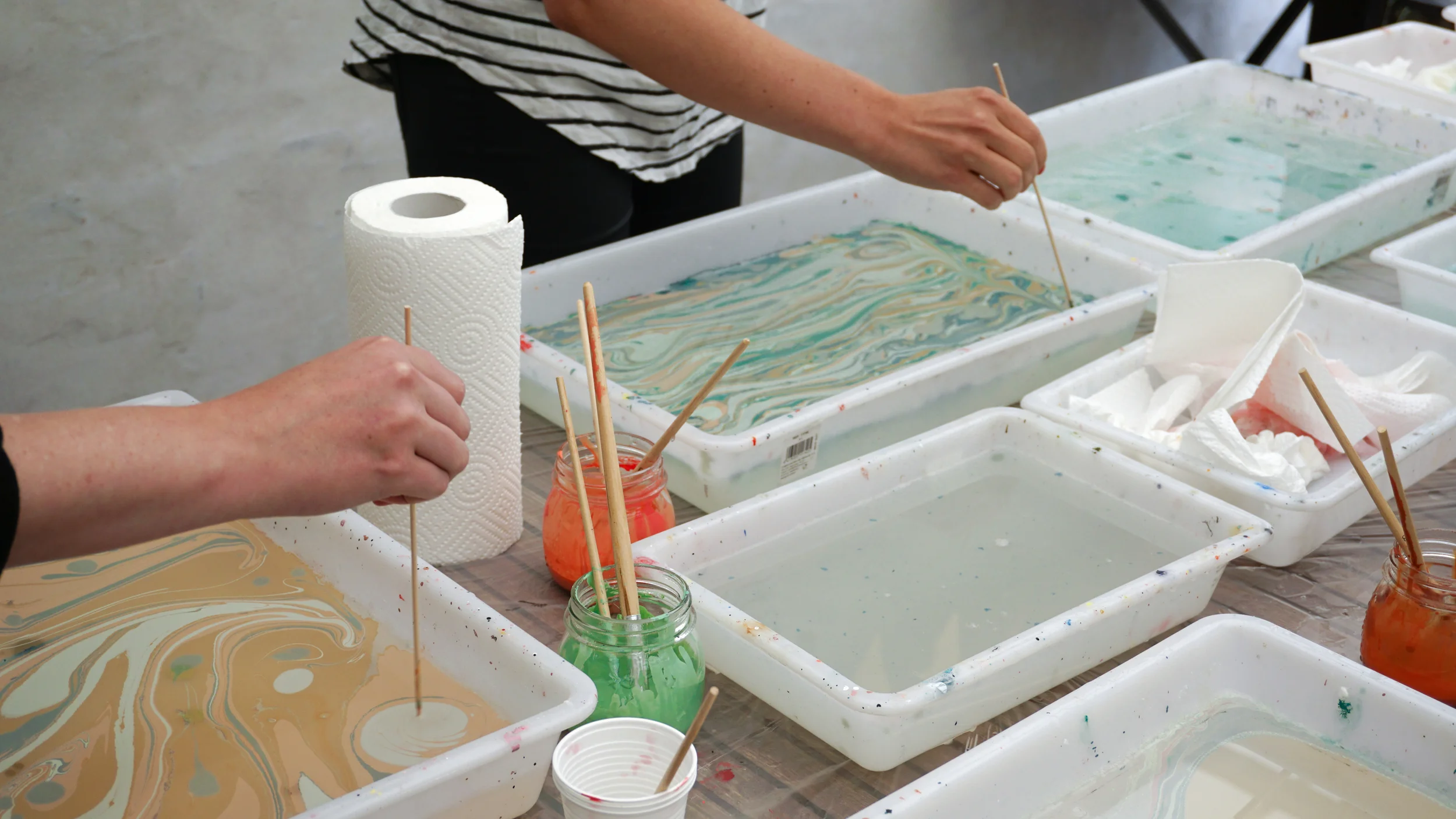Patterns can be made by dripping paint on the surface and then these can be altered by running a thin stick through the surface layer of the 'size'.