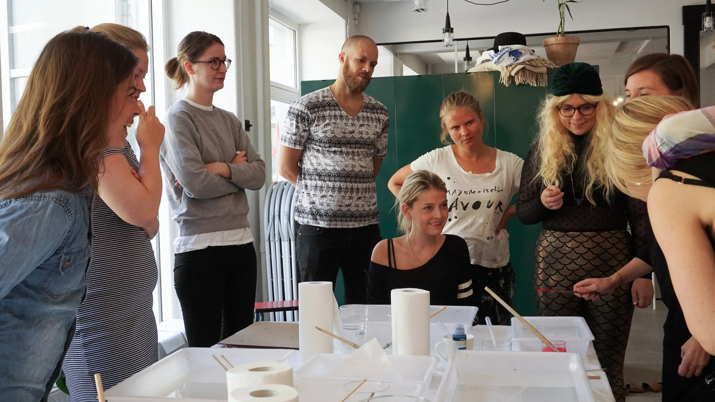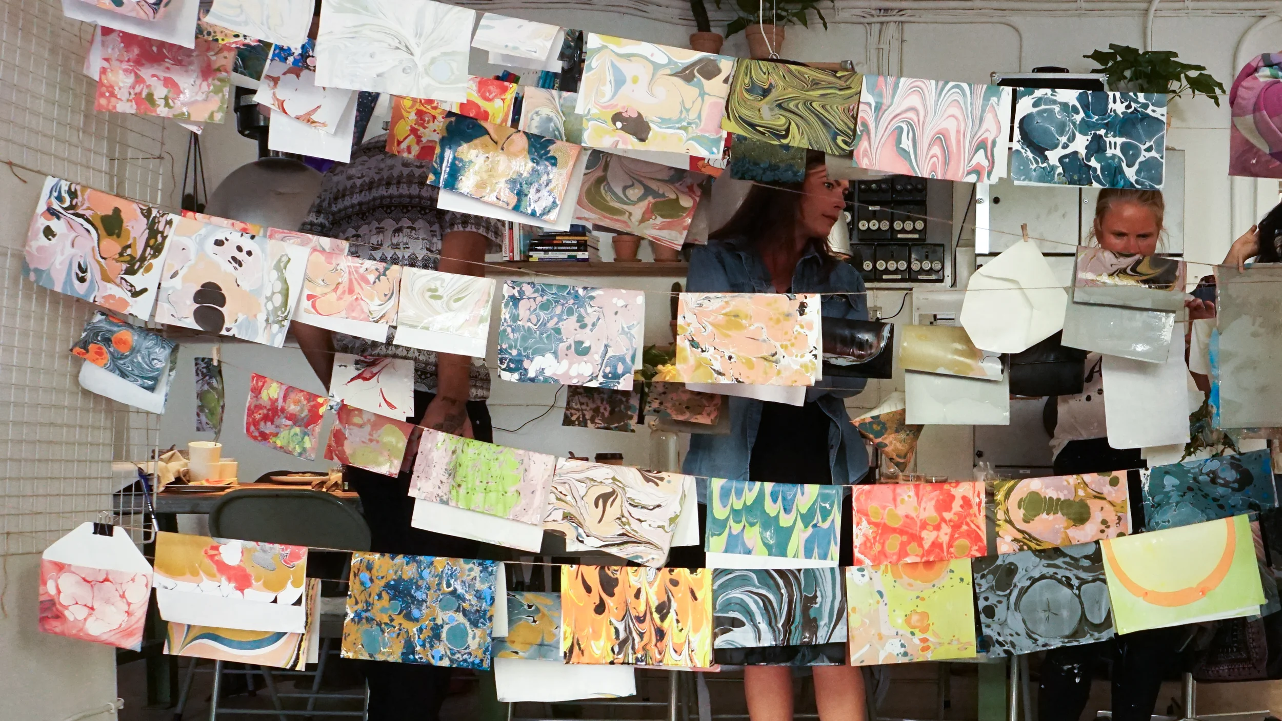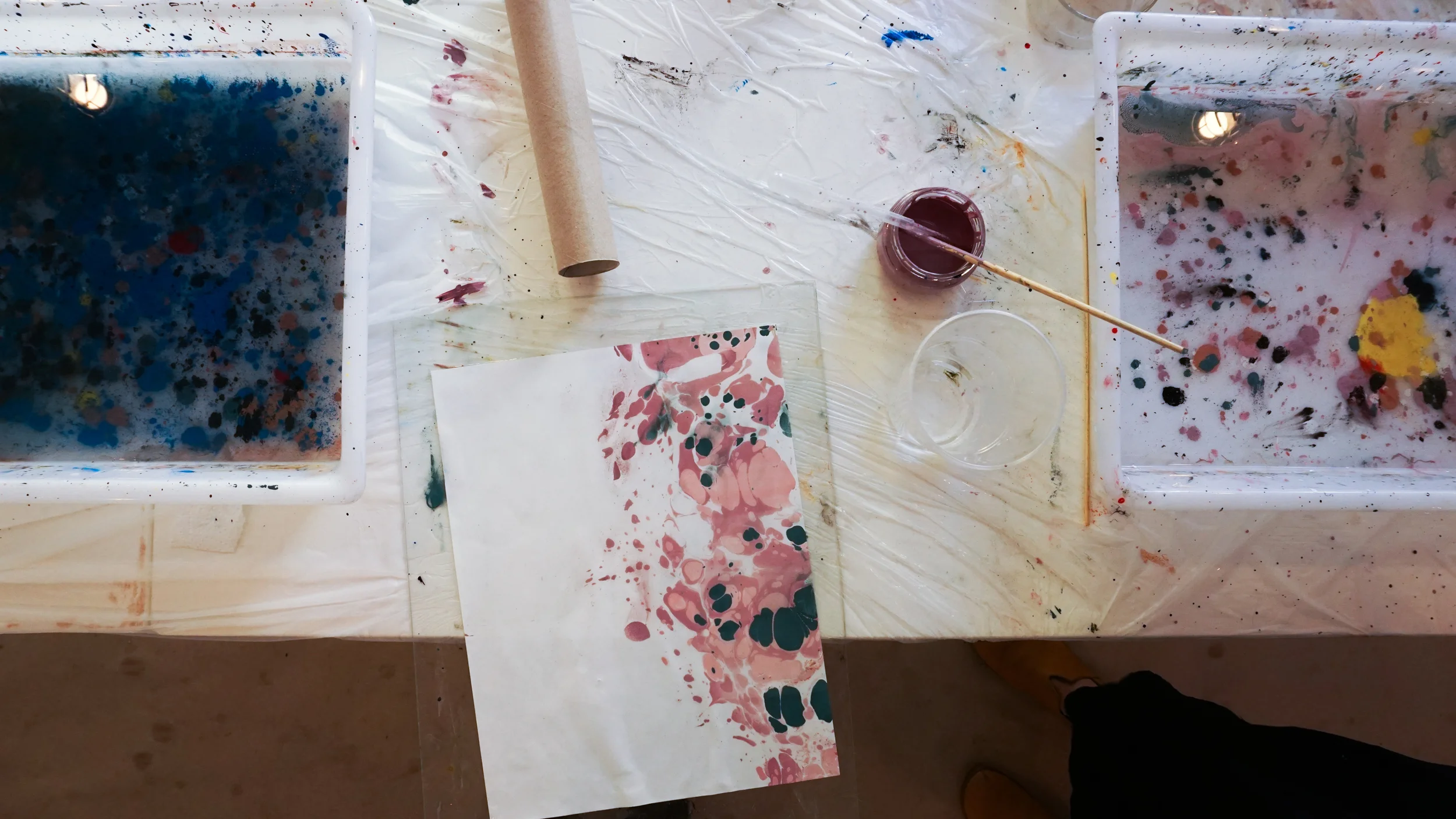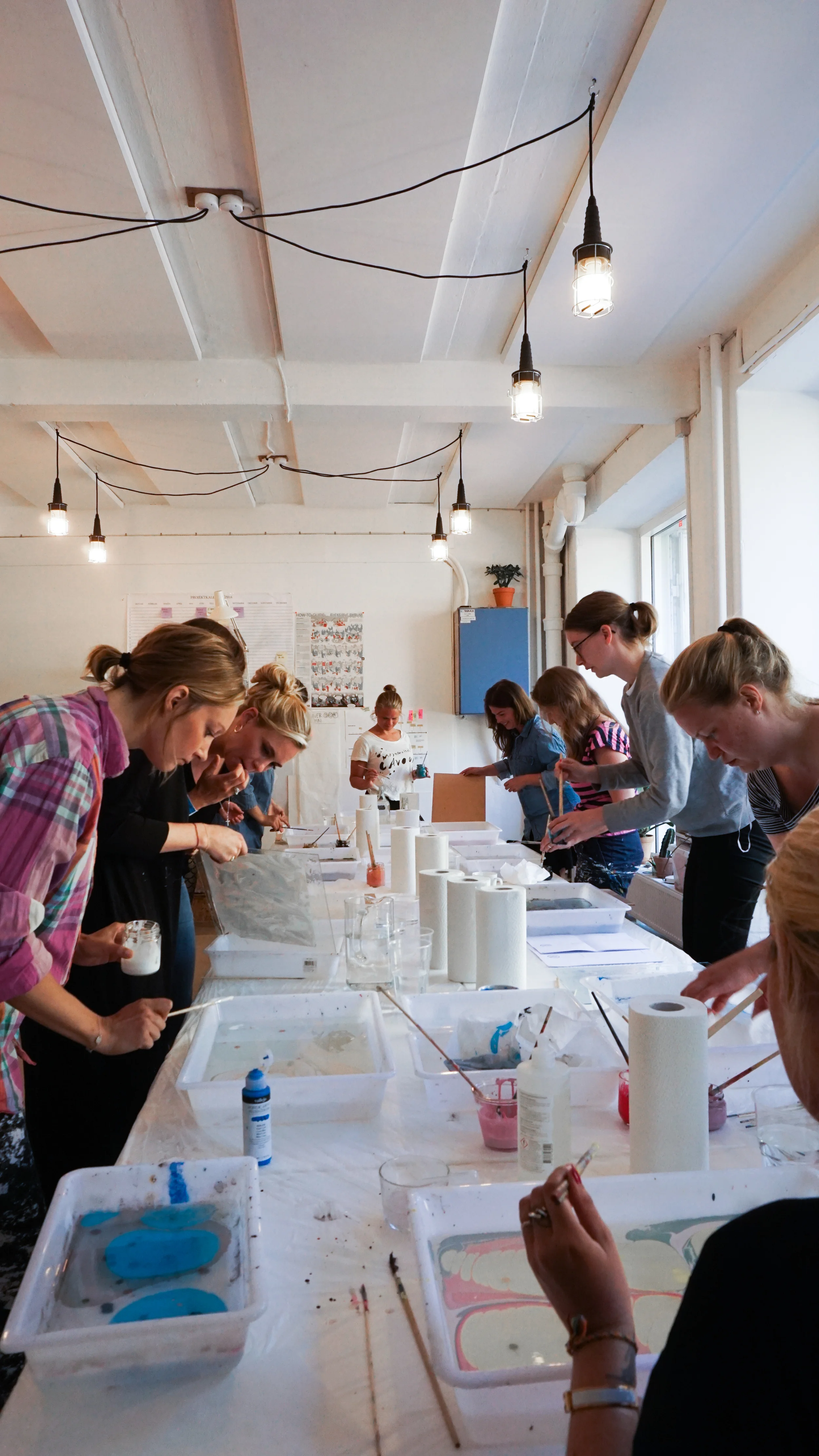 The third Copenhagen-based marbling workshop hosted by Marble Matter and myself took place in Skrå, a cool co-op workspace in Nørrebro. The space allowed for us to have 10 marbling participants, and this time the workshop focused on how to marble on paper. Everyone was given white, grey and black pieces of paper and finally on envelopes. We had premixed a range of colours for the participants to use, and during the workshop everyone got a chance to mix their own colours too.