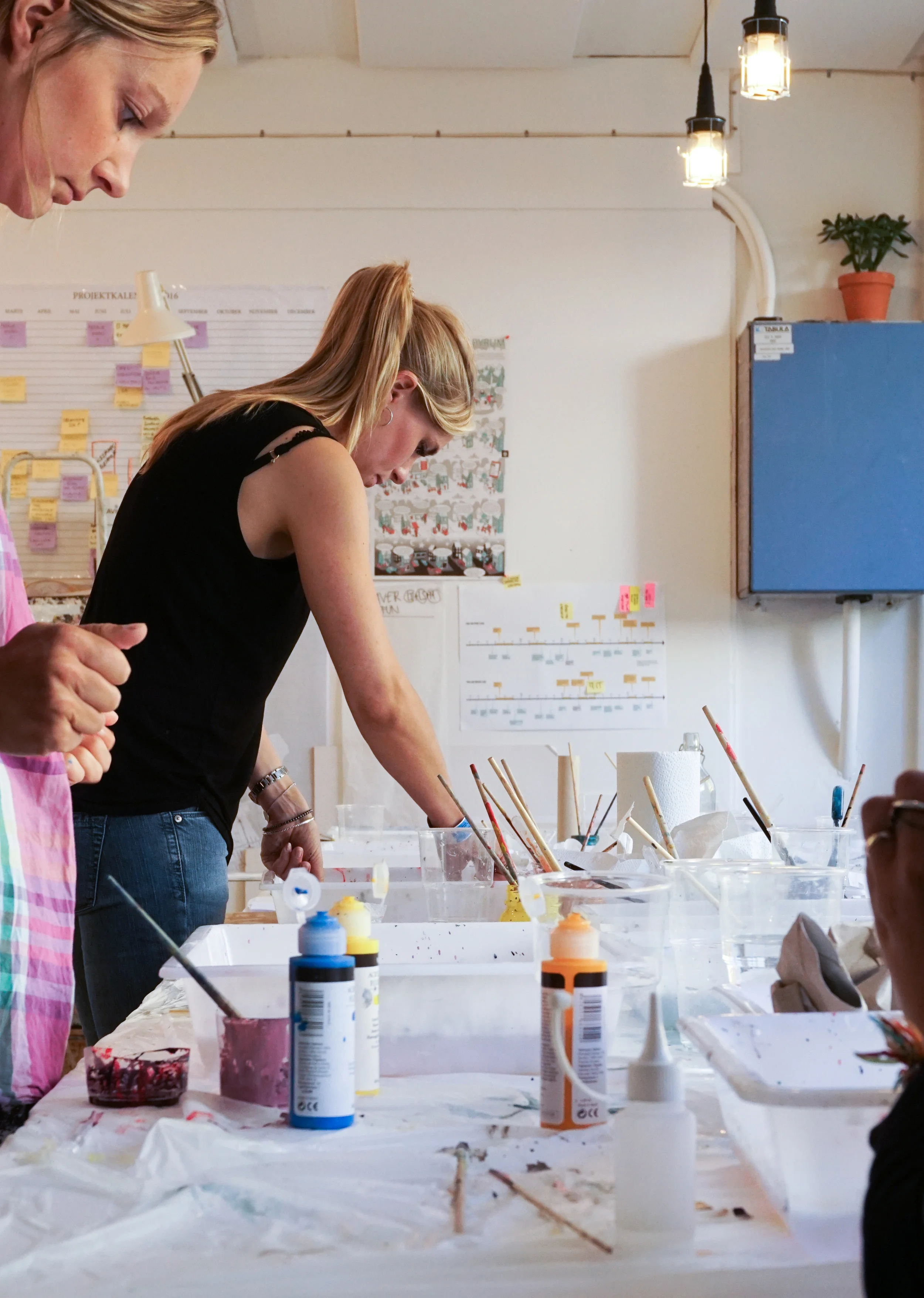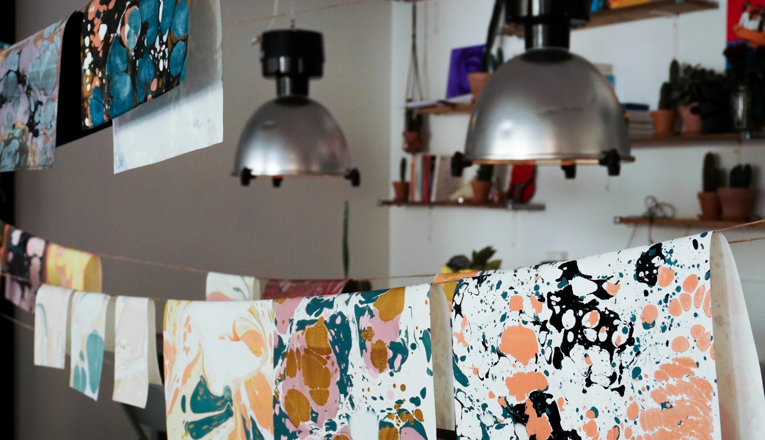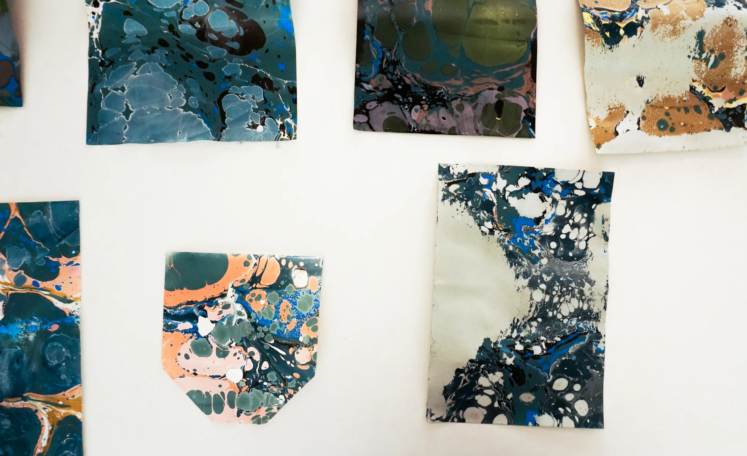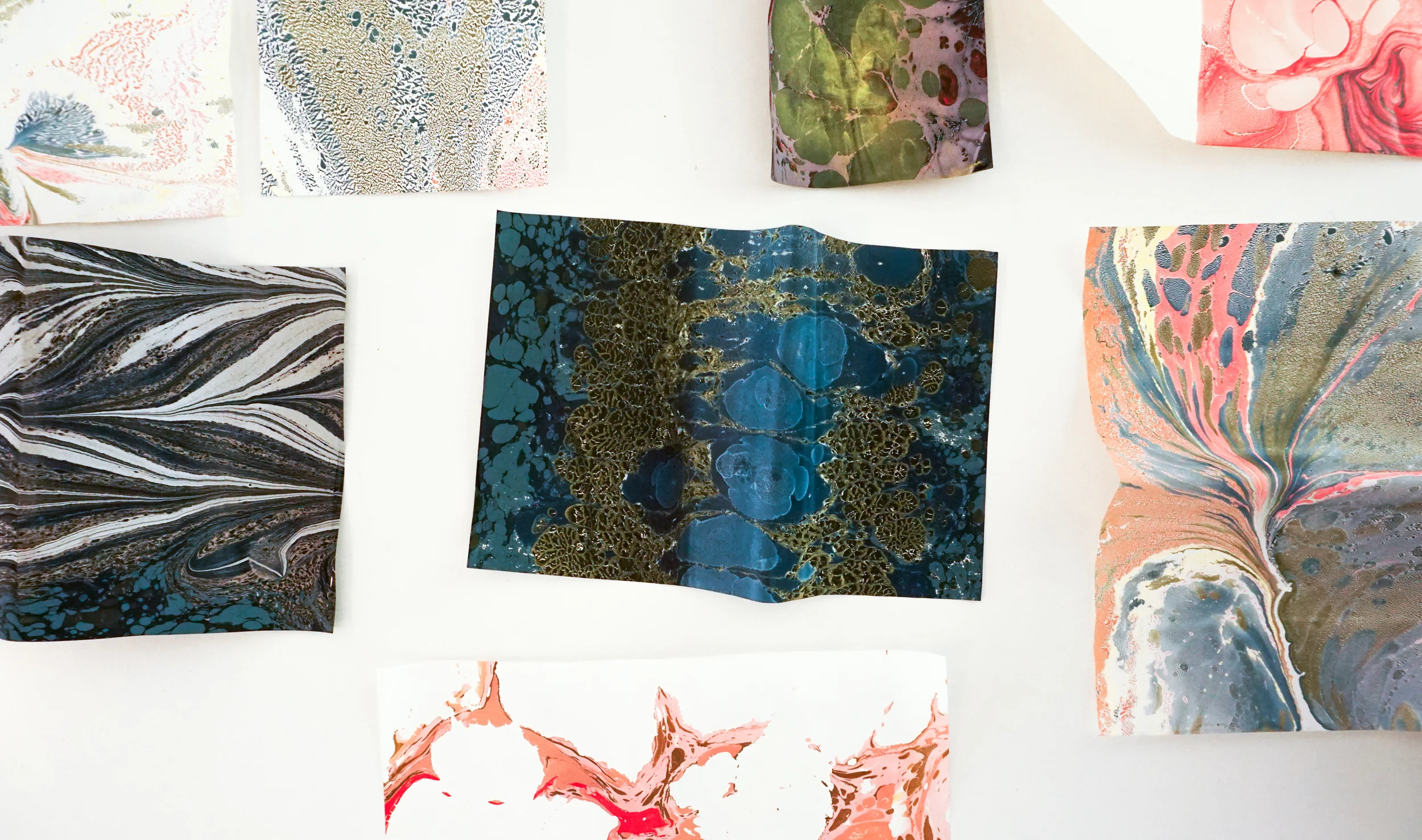 The third Copenhagen-based marbling workshop hosted by Marble Matter and myself took place in Skrå, a cool co-op workspace in Nørrebro. The space allowed for us to have 10 marbling participants, and this time the workshop focused on how to marble on paper. Everyone was given white, grey and black pieces of paper and finally on envelopes. We had premixed a range of colours for the participants to use, and during the workshop everyone got a chance to mix their own colours too.